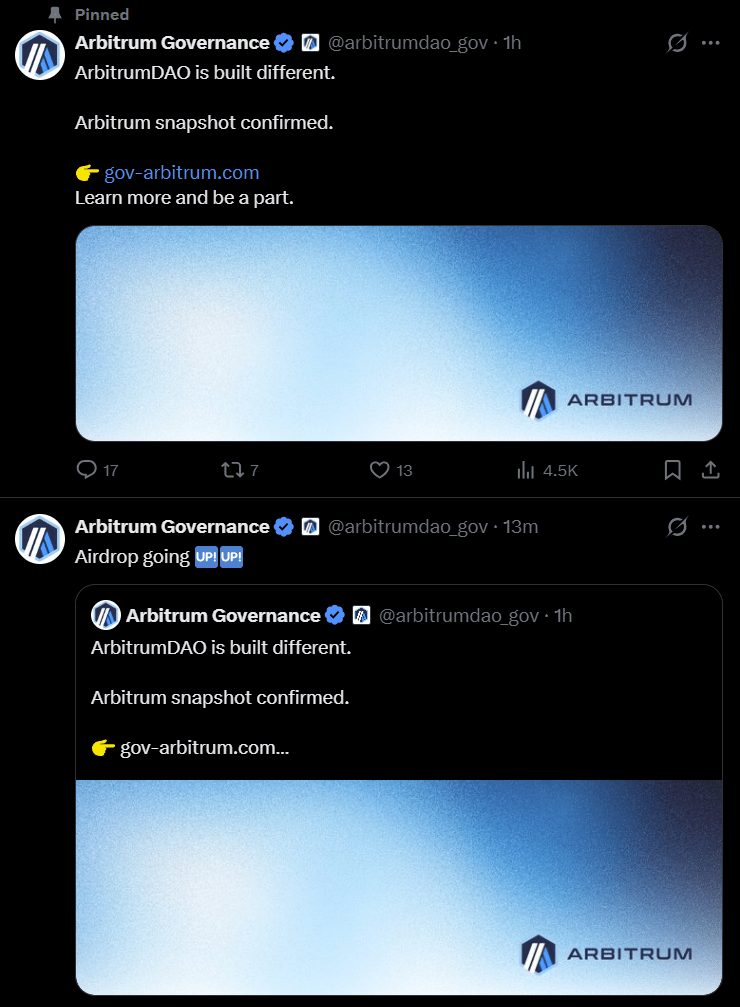 The @arbitrumdao_gov account has been compromised. Do not click any links or interact with posts from that account until further notice.