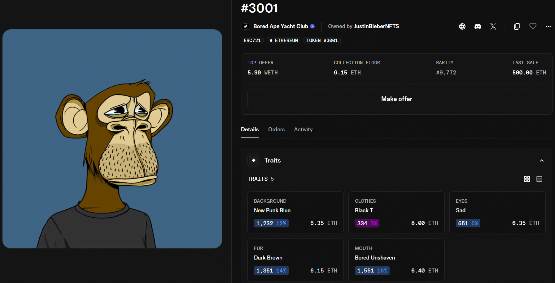 Bieber holds at least one additional piece from the series, ape #3850, which he acquired for roughly $470,000 shortly after his first purchase.