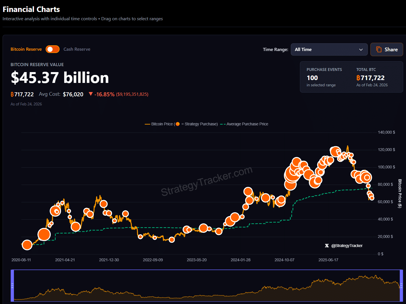 The firm holds 717,722 BTC purchased for roughly $54.5 billion at an average cost of approximately $76,000 per coin. With Bitcoin trading around $63,100 in early New York hours today, the portfolio’s market value has fallen to around $45 billion.