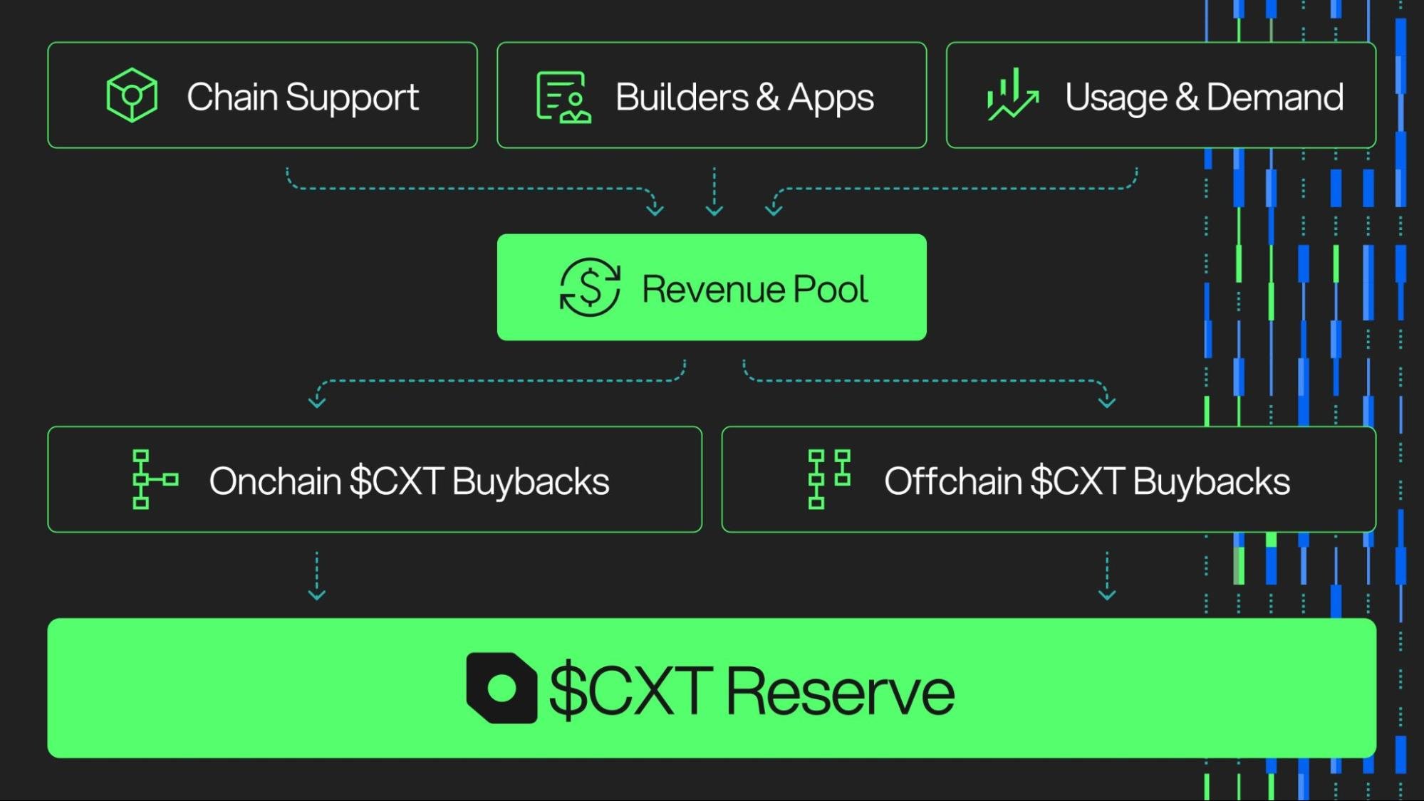 Chain integrations, grants, GoldRush usage, SpeedRun vibe coding, and more represent a mix of onchain and offchain sources of revenue. Some of that revenue is already being redirected to onchain buybacks automatically, but now much more will be directed towards offchain periodic $CXT buybacks for transaction execution efficiency.