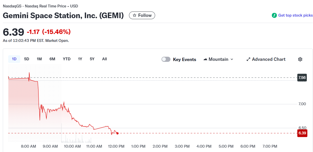 Gemini Space Station (GEMI), which operates the Gemini crypto exchange, saw its shares drop 15% during Tuesday’s trading session after the company disclosed the departure of senior executives.