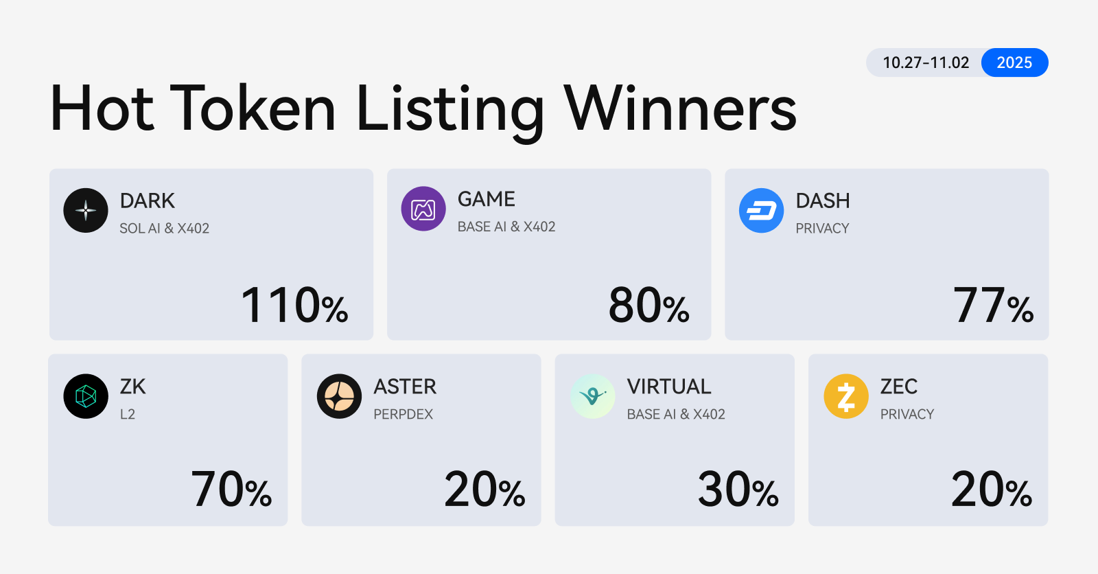 Privacy sector reignited! HTX hot listings weekly recap (Oct 27-Nov 2): Top gainer DARK soars 110%, as AI and privacy lead dual rallies