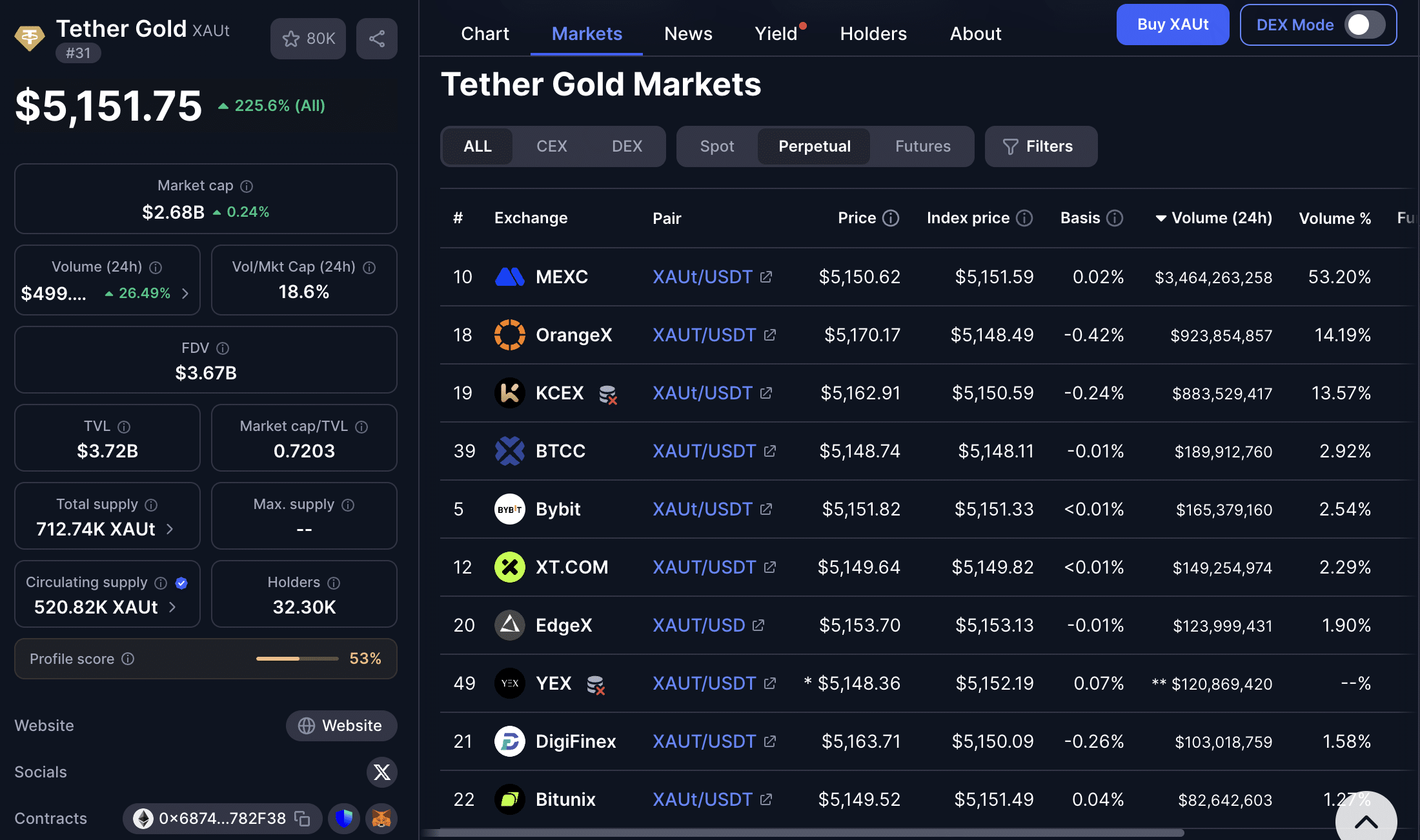 MEXC ranks No. 1 in XAUT perpetual volume globally, demonstrating strong liquidity and user activity
