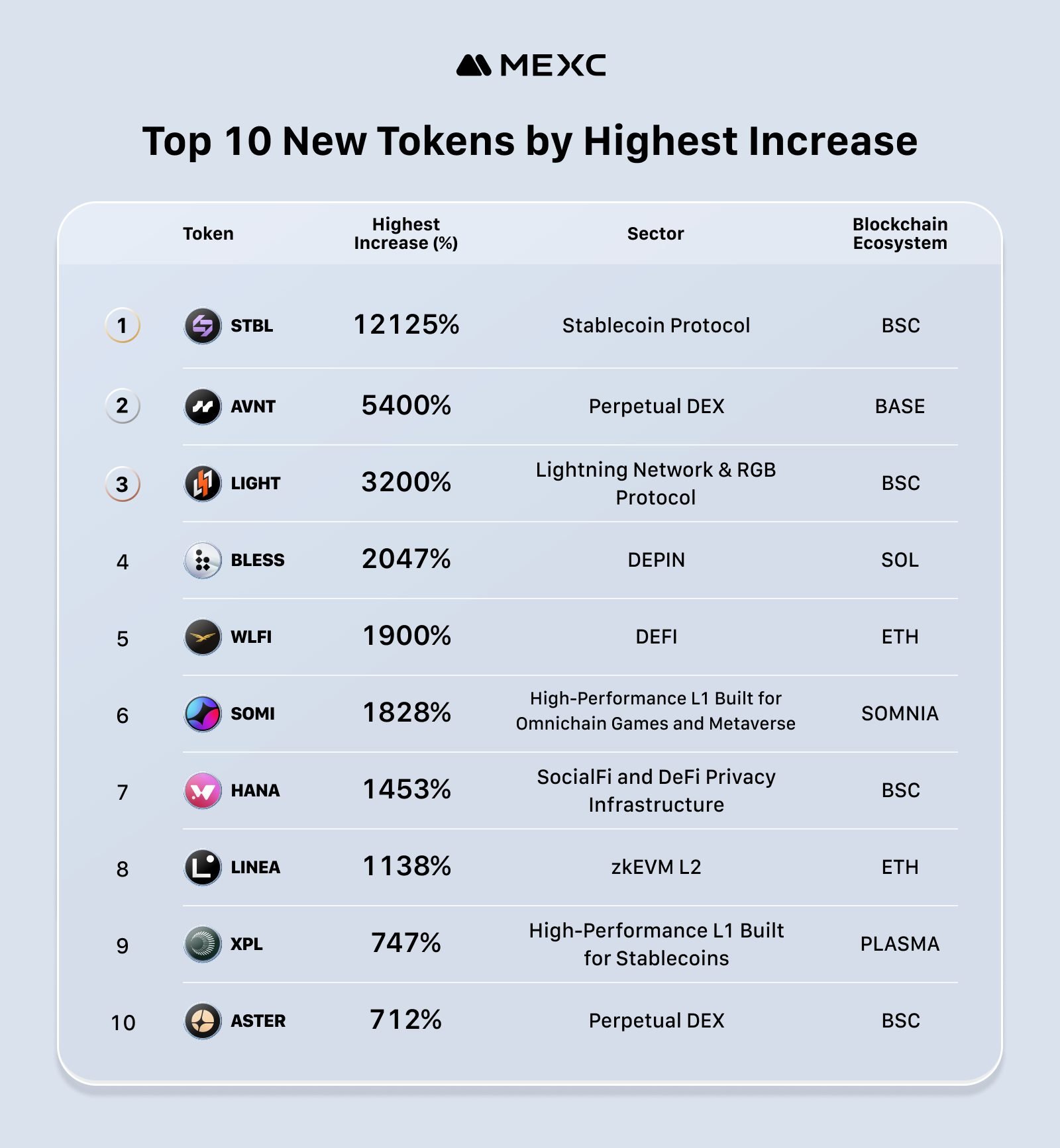 Perpetual DEX, AI, and stablecoin-linked projects led MEXC’s top-performing tokens. The top 10 tokens by spot trading volume delivered an average gain of +2,620%, up 47% from Q2. Flagship Perpetual DEX tokens such as AVNT (+5,400%) and ASTER (+712%) set the tone for the month, supported by Base and BSC chain ecosystems.