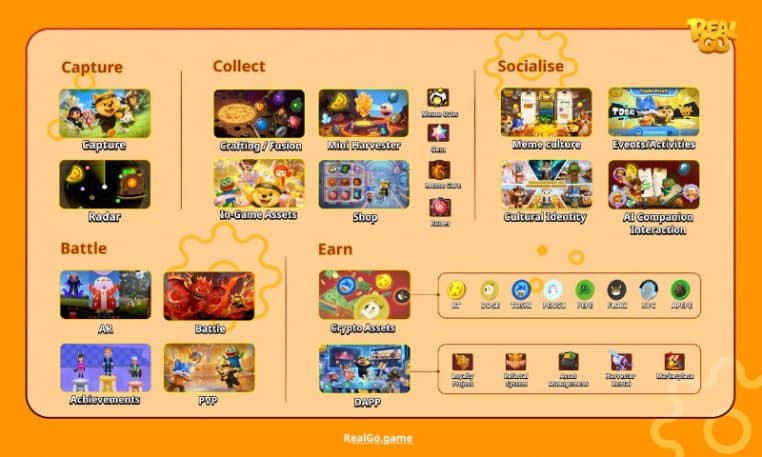 RealGo is an immersive AR + AI + Web3 consumer application and gaming ecosystem on BNB Chain built around location-based gameplay, where meme IP is transformed into interactive mobile experiences. Through one connected platform, users can capture, collect, socialise, battle, and earn while engaging with meme characters, community features, rewards, and onchain utilities. RealGo presents itself as a Meme 3.0 platform designed to bridge mainstream mobile gaming and Web3 participation.