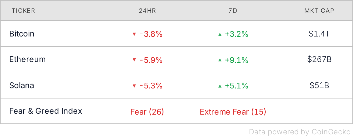 Bitcoin fell below $72K, Ethereum dipped near $2,200, Solana moved toward $89, and XRP traded around $1.45.