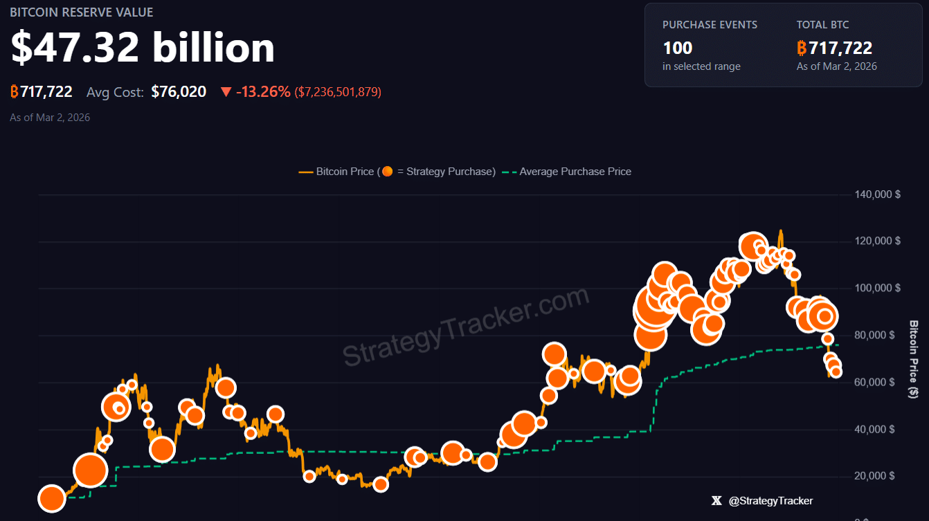 Strategy’s aggregate Bitcoin position now carries a cost basis of $54.7 billion, or roughly $75,985 per coin. With Bitcoin trading well below that level, the company faces estimated unrealized losses of $7.2 billion.