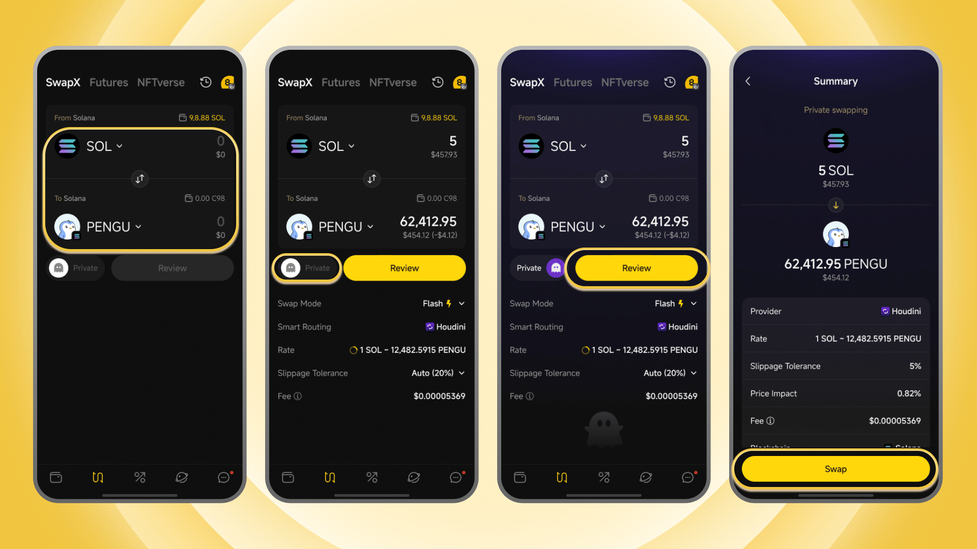 - Private Swap: Helping reduce the visibility of transaction patterns. This also helps mitigate the risks of predatory bots and front-running by reducing the visibility of trading intent.